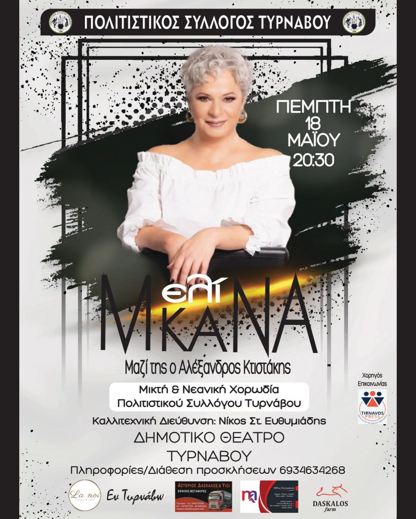 Ο Πολιτιστικός Σύλλογος Τυρνάβου διοργανώνει συναυλία με τη Μελίνα Κανά και τον Αλέξανδρο Κτιστάκη.