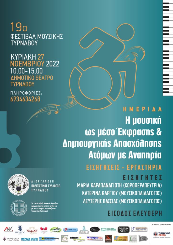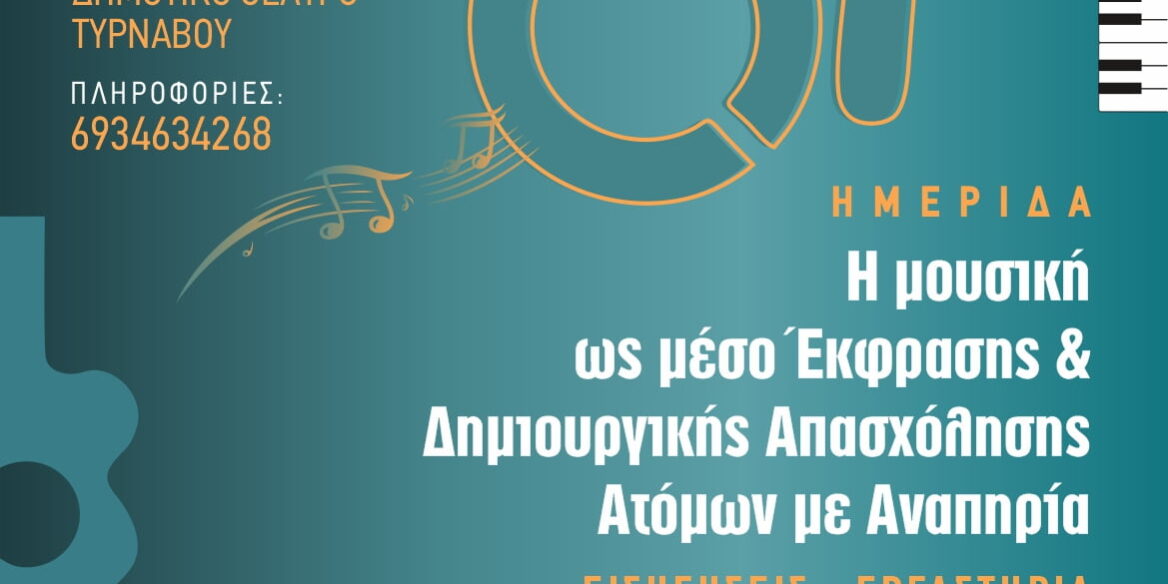 Ο Πολιτιστικός Σύλλογος Τυρνάβου στα πλαίσια του 19ου Φεστιβάλ Μουσικής Τυρνάβου και με την ευκαιρία της Παγκόσμιας Ημέρας Ατόμων με Αναπηρία διοργανώνει Ημερίδα με θέμα “Η Μουσική ως Μέσο Έκφρασης και Δημιουργικής Απασχόλησης Ατόμων με Αναπηρία“.