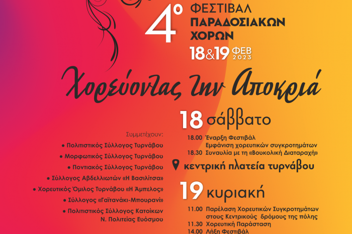 Φεβ132023 «Χορεύοντας την Αποκριά» το 2ήμερο 18-19 Φεβρουαρίου στον Τύρναβο Εκδηλώσεις, Χορευτικά Τμήματα13/02/2023