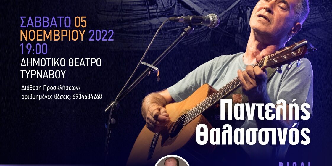 Έναν από τους πλέον αξιόλογους Έλληνες τραγουδιστές, τον Παντελή Θαλασσινό καθώς και τον κορυφαίο μουσικό Κυριάκο Γκουβέντα στο βιολί θα έχουν την ευκαιρία να απολαύσουν οι θεατές που θα βρεθούν στη συναυλία που διοργανώνει ο Πολιτιστικός Σύλλογος Τυρνάβου το Σάββατο, 5 Νοεμβρίου και ώρα 19:00 στο Δημοτικό Θέατρο Τυρνάβου. Η εκδήλωση αποτελεί αφιέρωμα στην επίδραση της Μουσικής της Σμύρνης και της Μικράς Ασίας στη Σύγχρονη Ελληνική Μουσική δημιουργία.