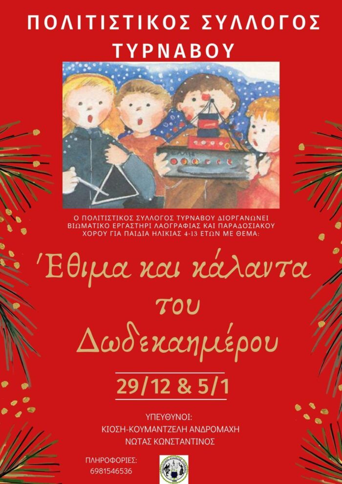 Για δεύτερη συνεχόμενη χρονιά ο Πολιτιστικός Σύλλογος Τυρνάβου διοργανώνει Χριστουγεννιάτικο εργαστήρι για παιδιά! Υπεύθυνοι Εργαστηρίου: Ανδρομάχη Κιόση Κώστας Μαντές Λεπτομέρειες προσεχώς…