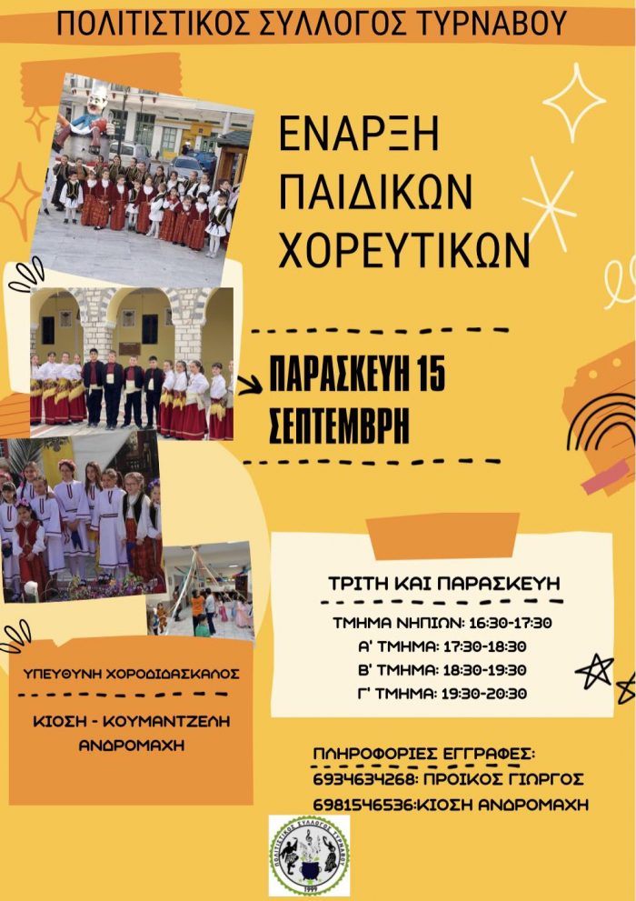 Ο Πολιτιστικός Σύλλογος Τυρνάβου ανακοινώνει την έναρξη των παιδικών χορευτικών τμημάτων για τη νέα περίοδο. Οι πρόβες γίνονται κάθε Τρίτη και Παρασκευή. Τμήμα Προνηπίων-Νηπίων: 16:30-17:30 1ο Παιδικό Τμήμα: 17:30-18:30 2ο…