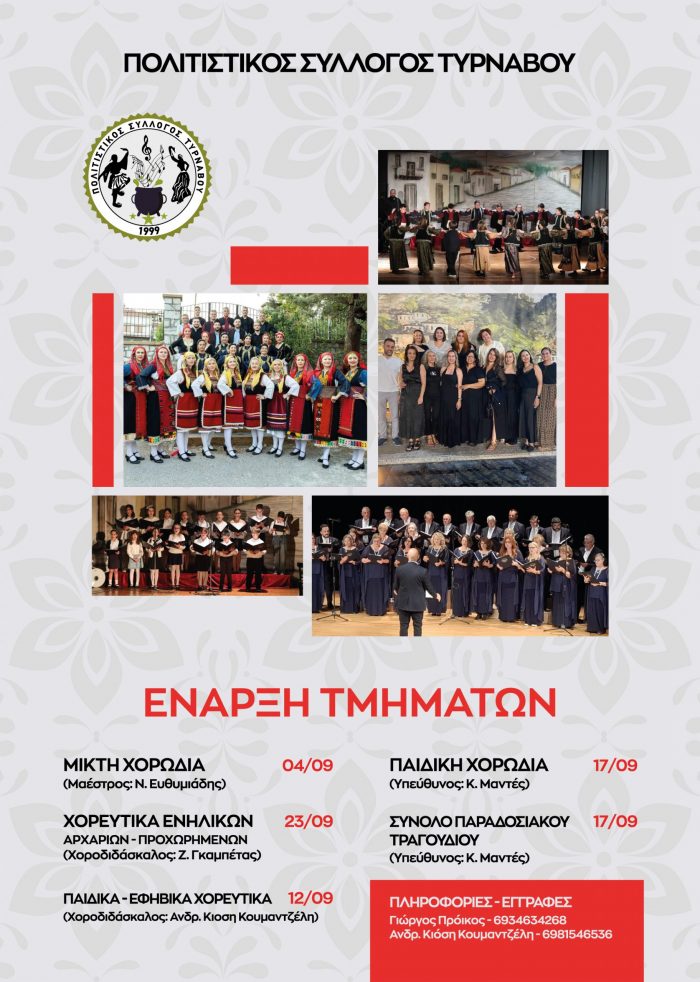 Ο Πολιτιστικός Σύλλογος Τυρνάβου ανακοινώνει την έναρξη των τμημάτων του για τη νέα περίοδο. ΧΟΡΕΥΤΙΚΑ ΤΜΗΜΑΤΑ: ** ΝΕΟ ΤΜΗΜΑ!! Κρητικών Χορών (Υπεύθυνος Σ. Μαραγκοζάκης): Έναρξη Παρασκευή, 9/9, ώρα 21:00 **…