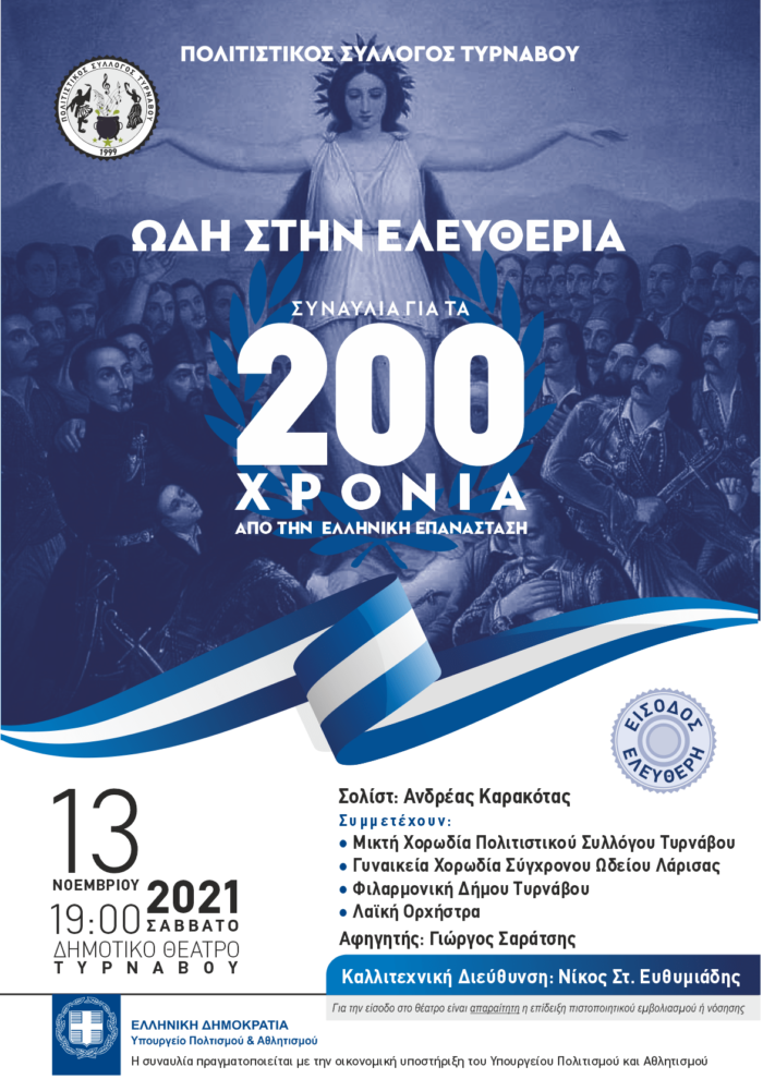 Ο Πολιτιστικός Σύλλογος Τυρνάβου σας προσκαλεί σε μία συναυλία αφιέρωμα στα 200 Χρόνια από την Ελληνική Επανάσταση το Σάββατο, 13 Νοεμβρίου και ώρα 19:30 στο Δημοτικό Θέατρο Τυρνάβου. Σολίστ: Ανδρέας…